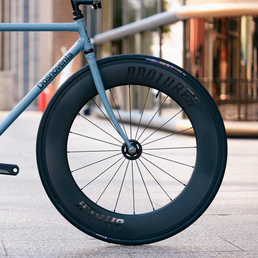 BROTURESオリジナルコンポーネントで揃えた手組みホイールはコスパのいい走れる仕上がり。軽さなら肩を並べられるほどのリムに、剛性もしっかりと実感できる品質高い走り。僕らスタッフも愛用しているアイテムです。