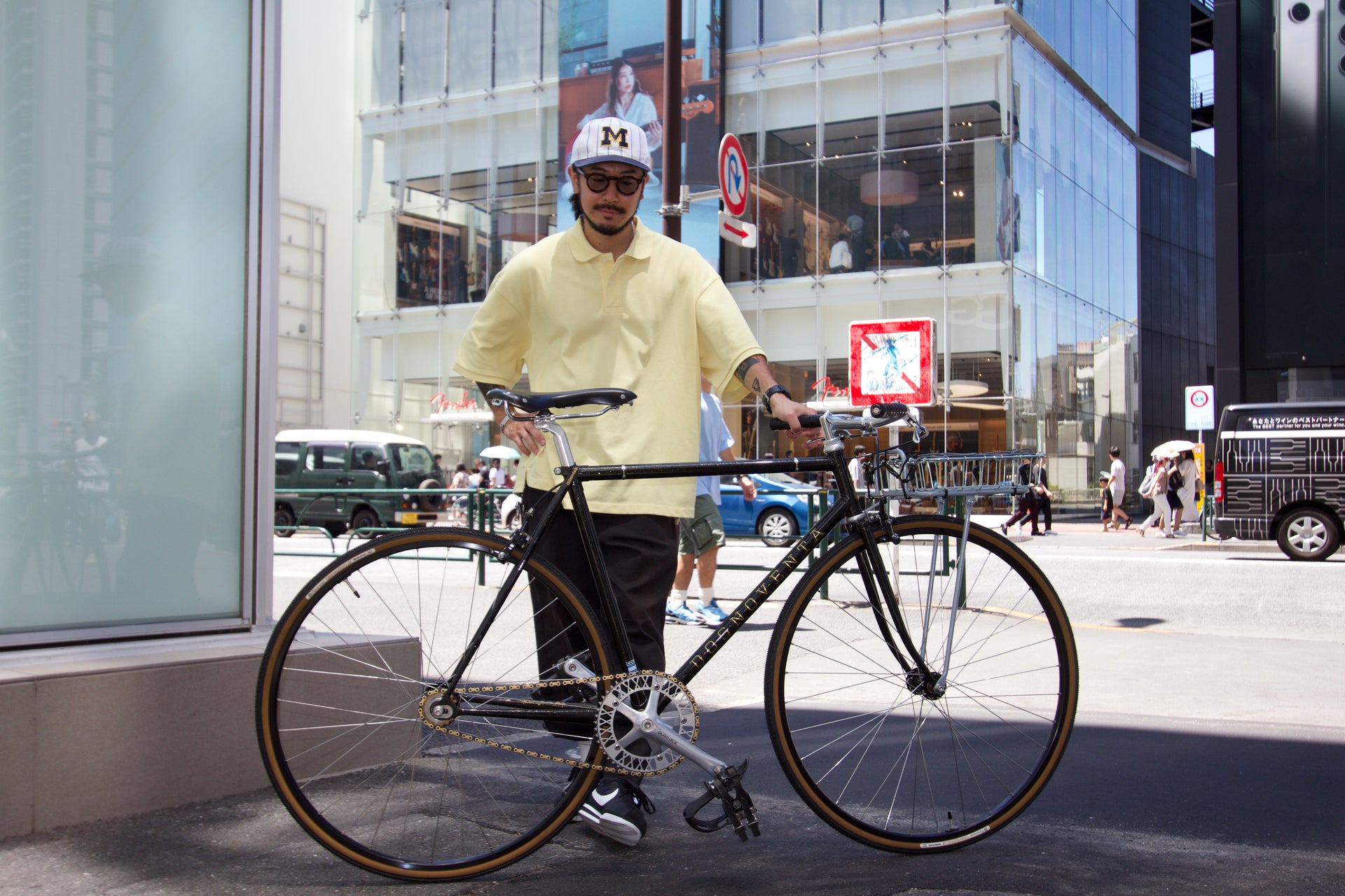 フロントにはラック/バスケットを付け、イケてるハンドル。タイヤは控えめなブロックタイヤ。
