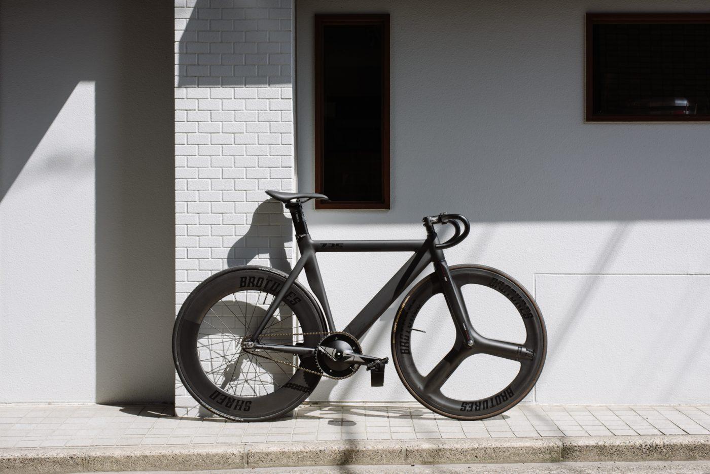 車体全体の軽量化はもちろんですが目で観て楽しむのもピストバイクの醍醐味。 フレーム本体の持ち味である極太のダウンチューブとカーボンホイールは”735TR専用パーツ”と言っても過言ではないくらいに格好良い。