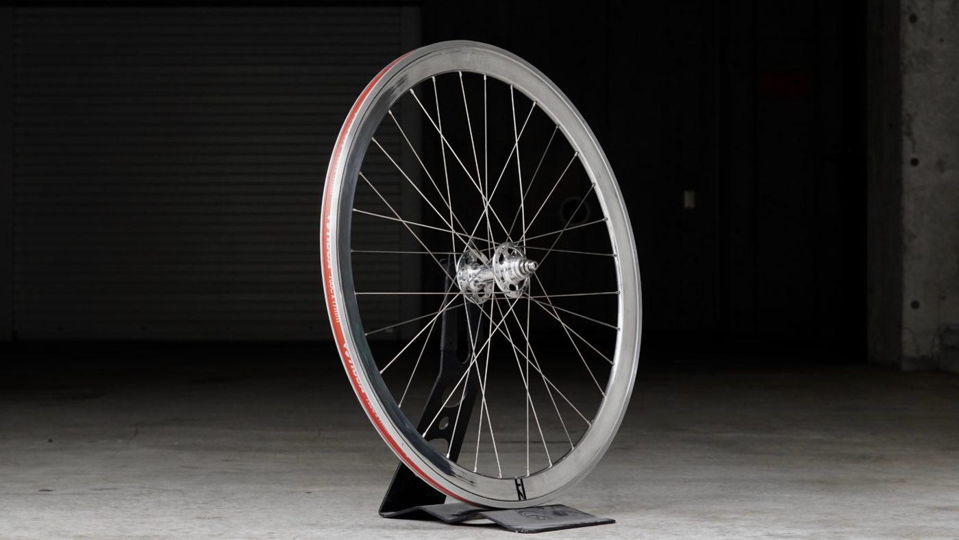 リムからハブまでオールポリッシュカラーがとってもクリーンな印象の手組みのリアホイールが入荷しました。