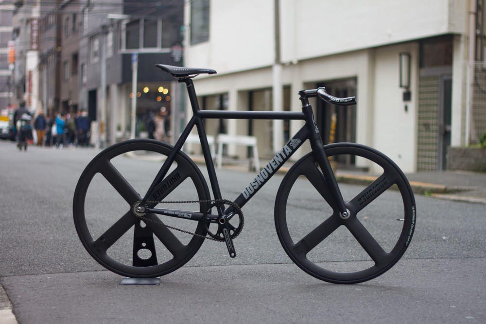 オールブラックでまとめたシンプルな1台。ホイールも4本バトンホイールでスッキリさせました。市場でも珍しい4本バトンホイールになりますので、街中で目を引くことは間違い無し。またノーマルホイールに比べバトンホイールはスポーク少なくなっています。走行速度の2倍で空気を切るホイールのスポークの数が増えれば、それだけ空気抵抗が多くなりますし、バトンホイールのように少なければその分空気抵抗も少なくなります。見た目の面でも性能の面でもバトンホイールはお勧めです。走り面に重要な心臓部分のクランクは力を逃さずにこいだ分だけ直接、力が伝わるダイレクトクランクをインストール。ダイレクトクランクの中でも一番有名なオムニウムをインストールしています。