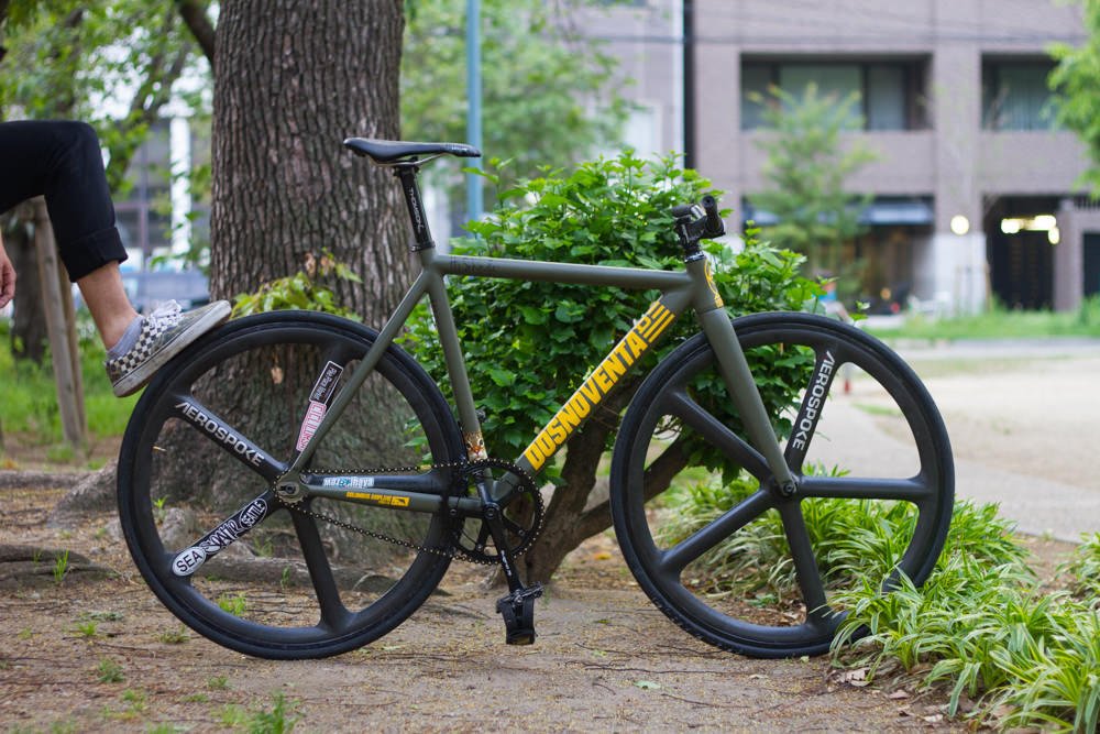 激しいライドもこなしたいという願望でMTBブランドのステムを使ったり、どしっとAEROSPOKEを前後にカスタムしとりと、今までのDOSNOVENTAのカスタムバイクではなかなか見ることがないパーツをセレクト。個性の溢れたオリジナルのある1台となりました。今回スナップさせて頂いた方は山道も走ったりするぐらいガンガン走行するお客様です。パーツも強度がありつつ走りもできる物をチョイスしています。 今回のお客様の様々なパーツを参考に自分だけのピストバイクを作り