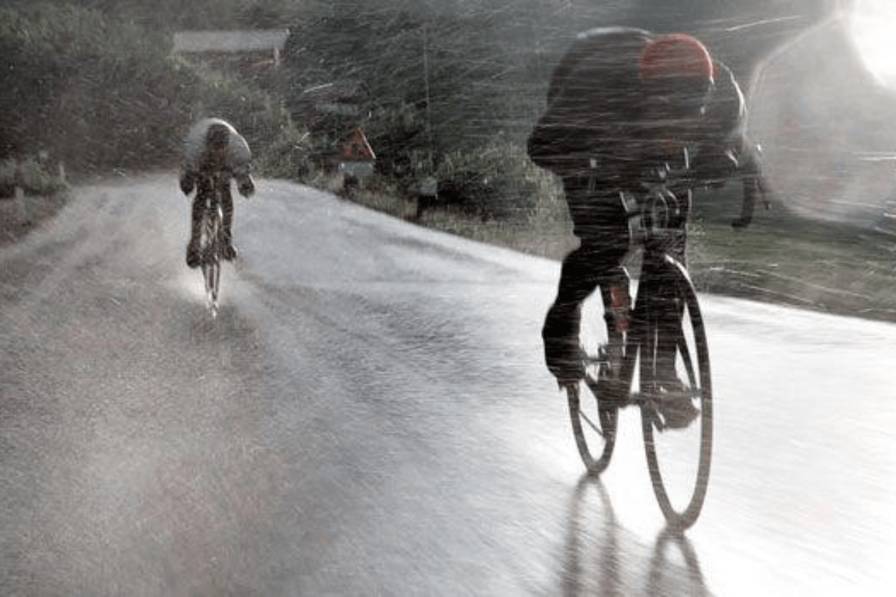 ちょっとした雨や路面が濡れた状態、「これくらいなら」って乗ってみたものの、ついた時には背中はビシャビシャ。