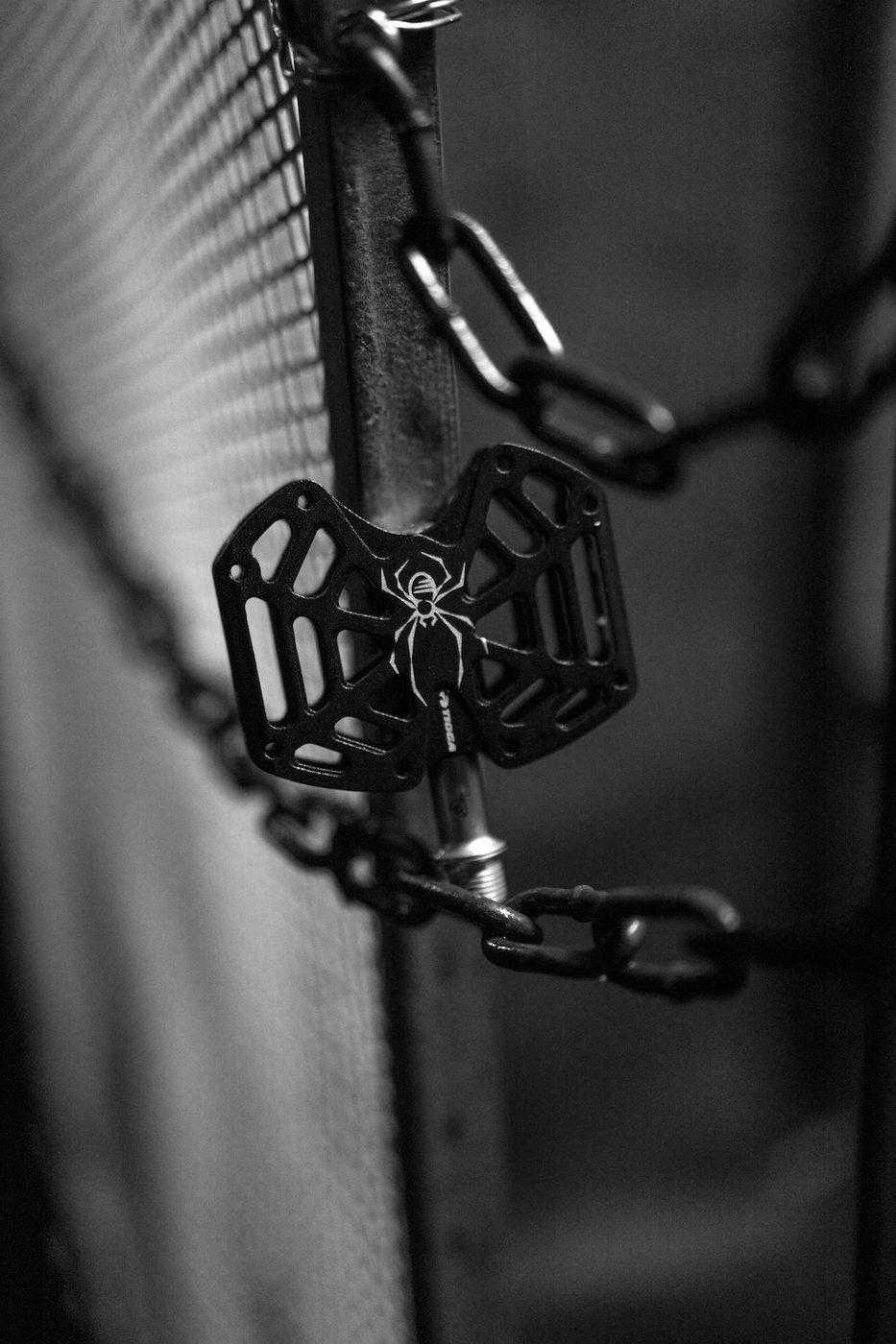 蜘蛛の巣のデザインとシャフトのハエがユニークなMTB系のペダルです。