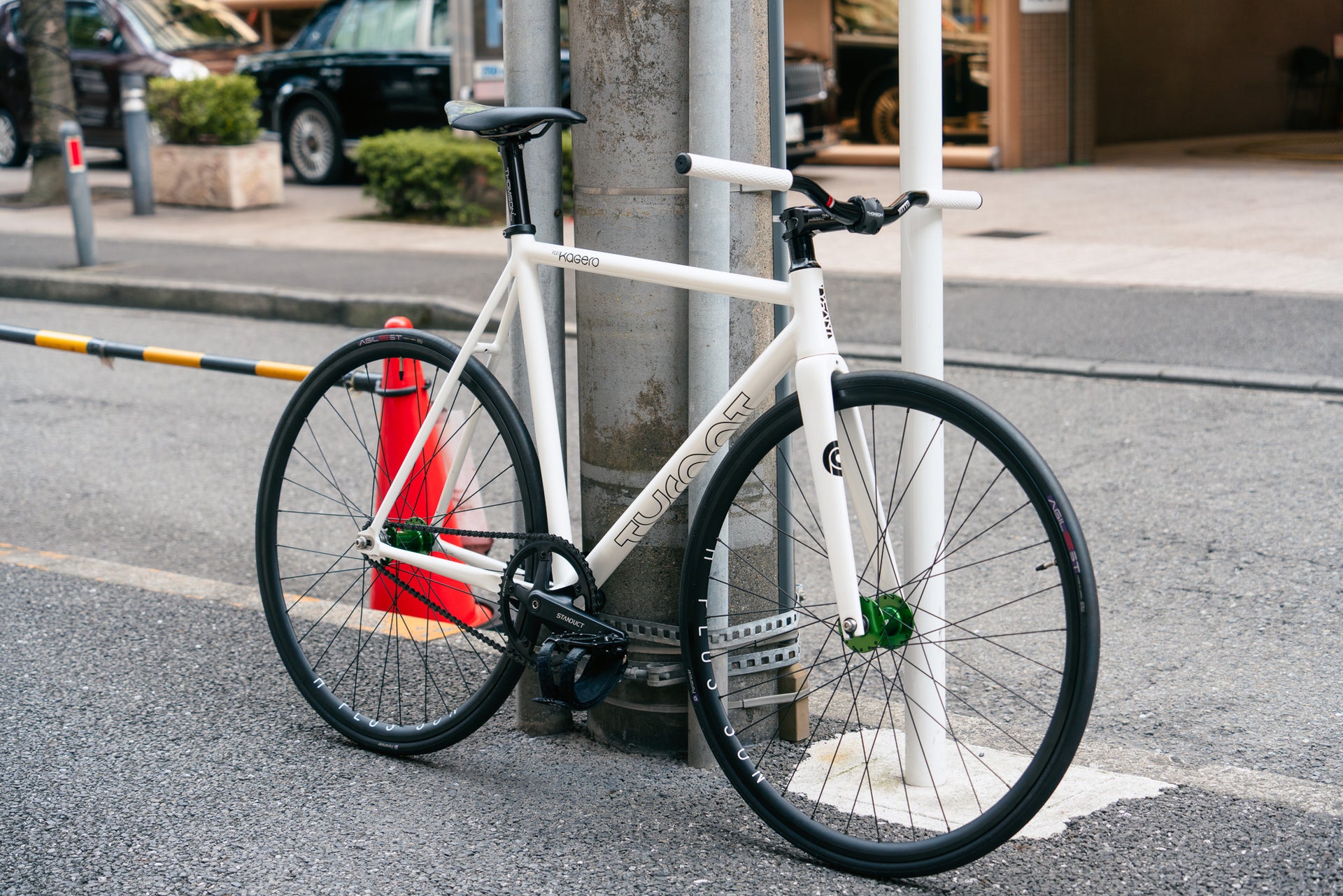 KAGEROはピストならではな前下がりのフレーム形状でアグレッシブなライドに向いています。