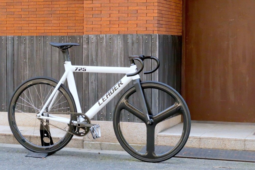 リアはおなじみのLEADER製カーボンホイールL44をDURA-ACEトラックハブで再構築したアップチャージホイール。